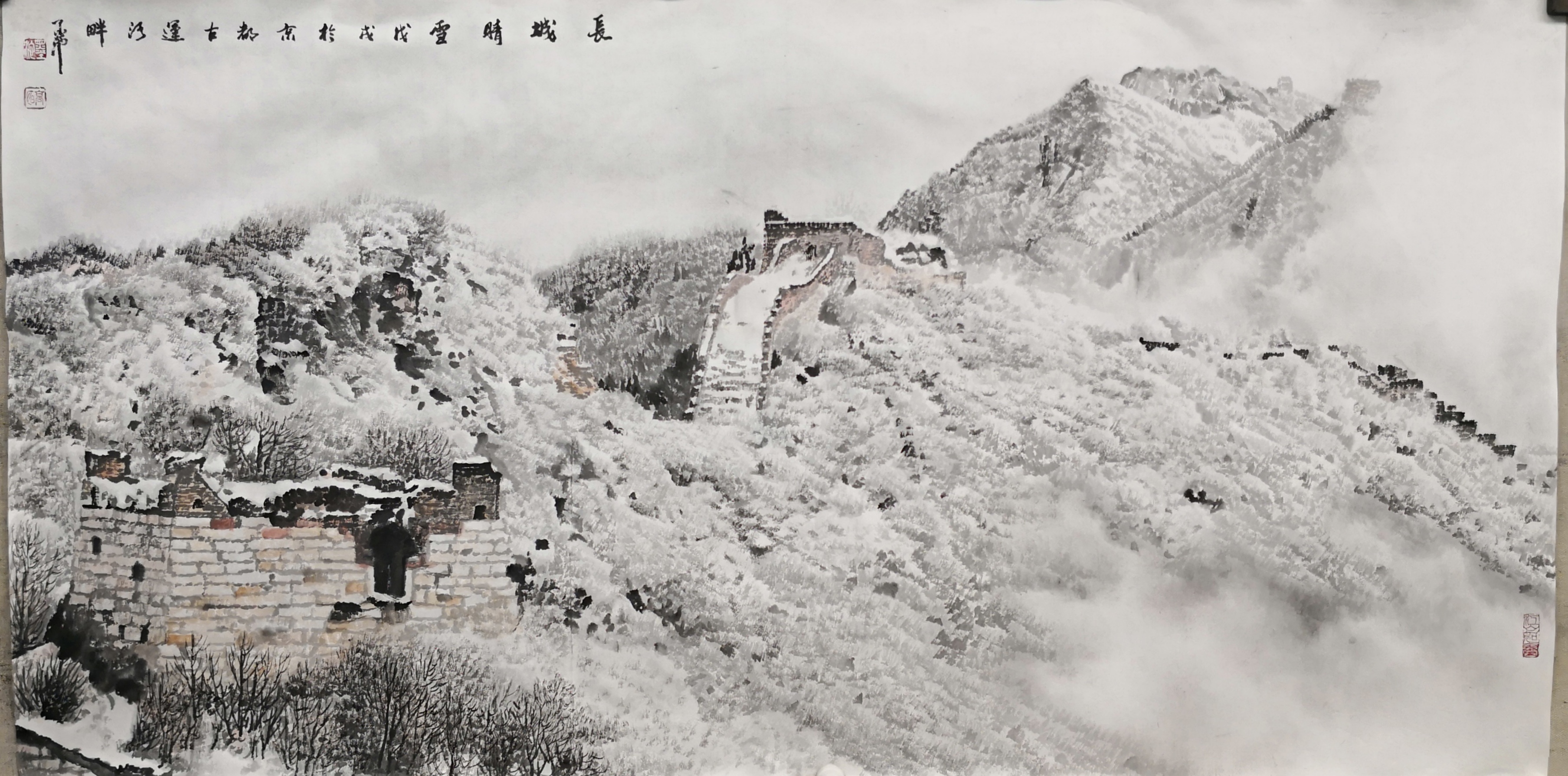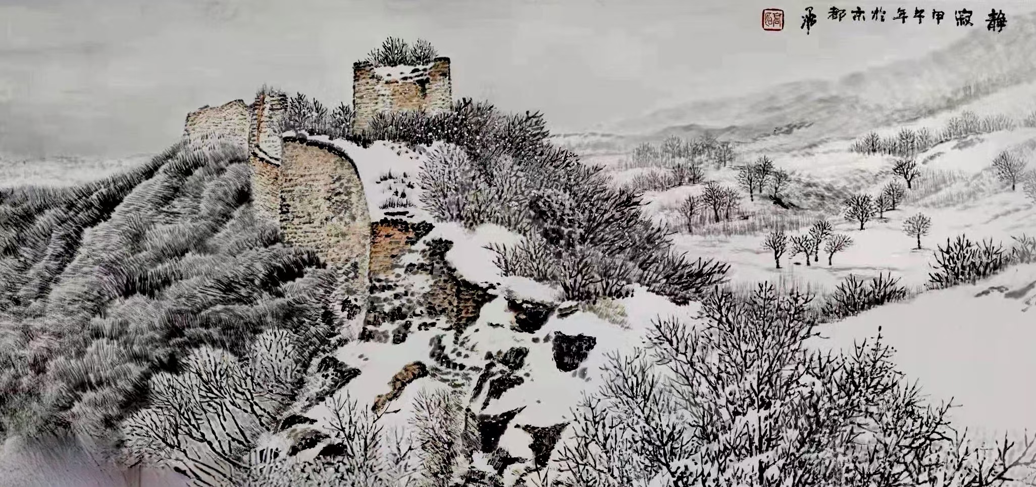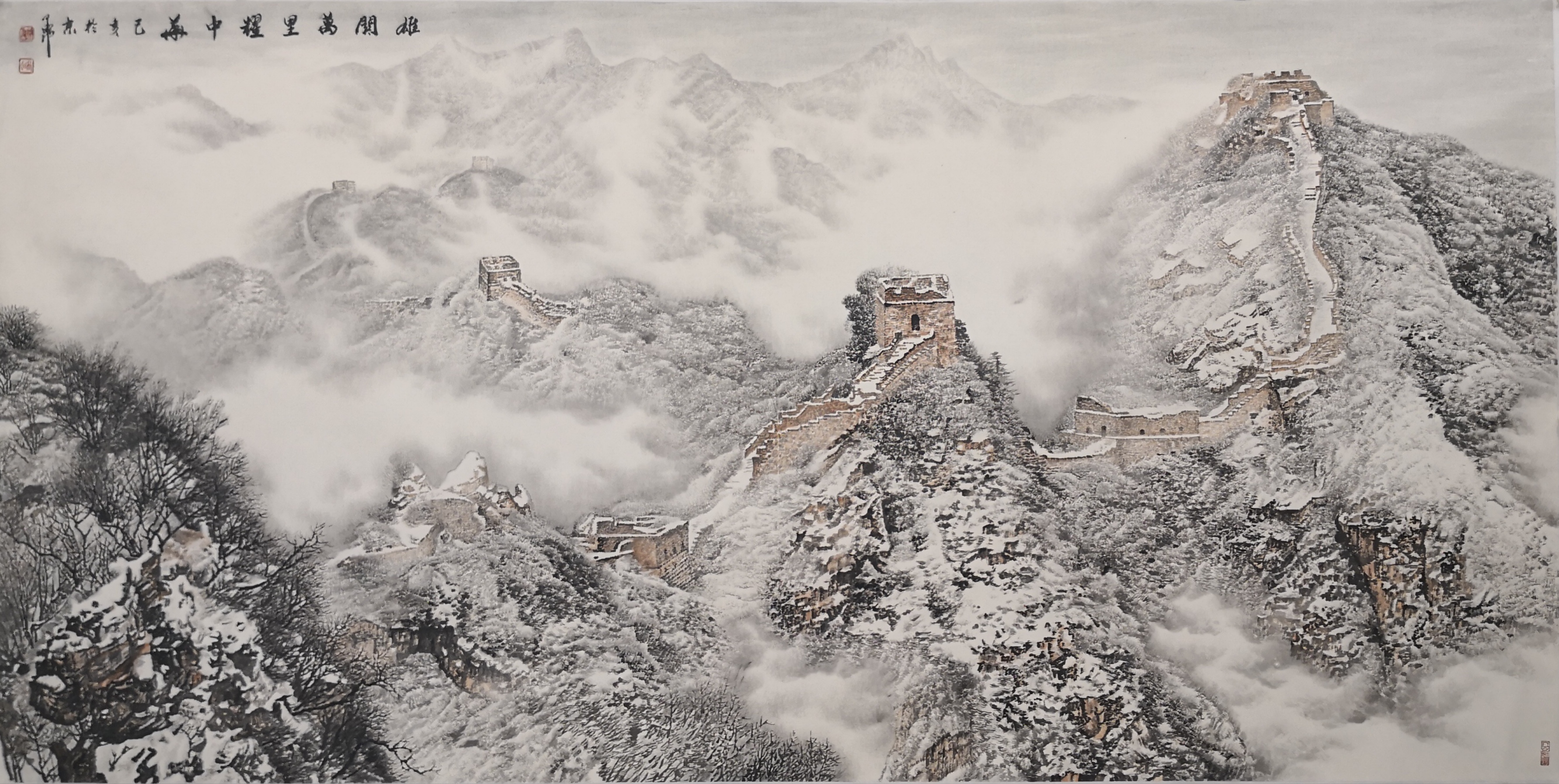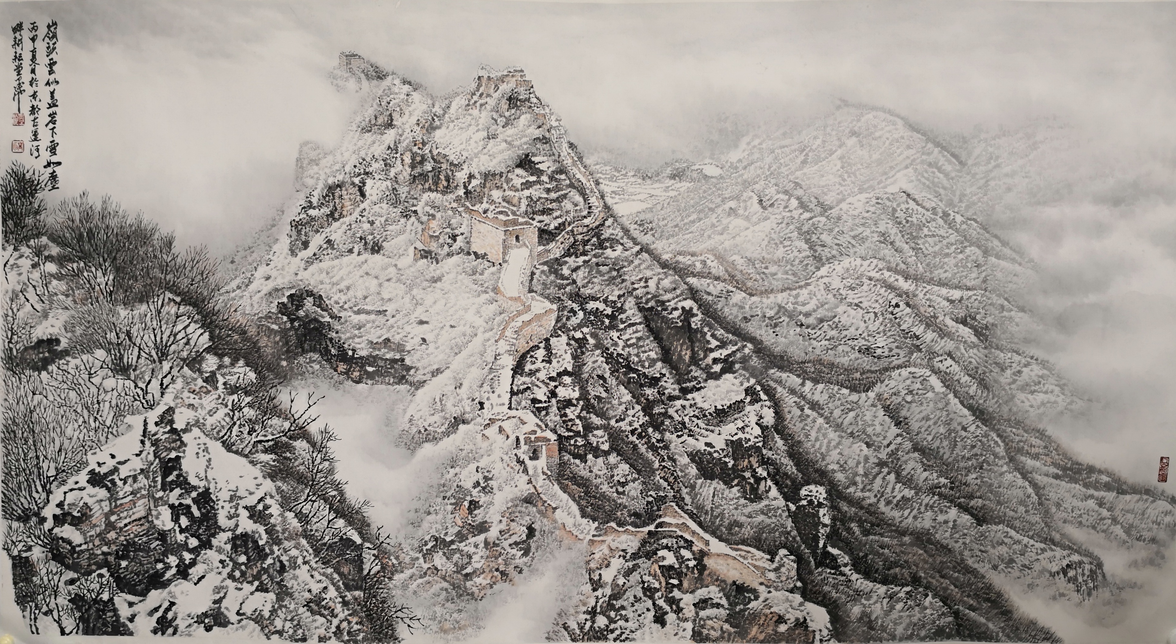 笔法的微观与宏观。高明独创“冰晶皴法”,以枯笔散锋轻扫纸面,营造出冰雪特有的晶莹质感;又以浓墨焦笔勾勒长城砖石,让千年沧桑跃然纸上。观其作画过程,时而如“银瓶乍破”般挥洒写意,时而如“绣花引针”般精雕细琢,在宏大气象与微观细节间游刃有余。