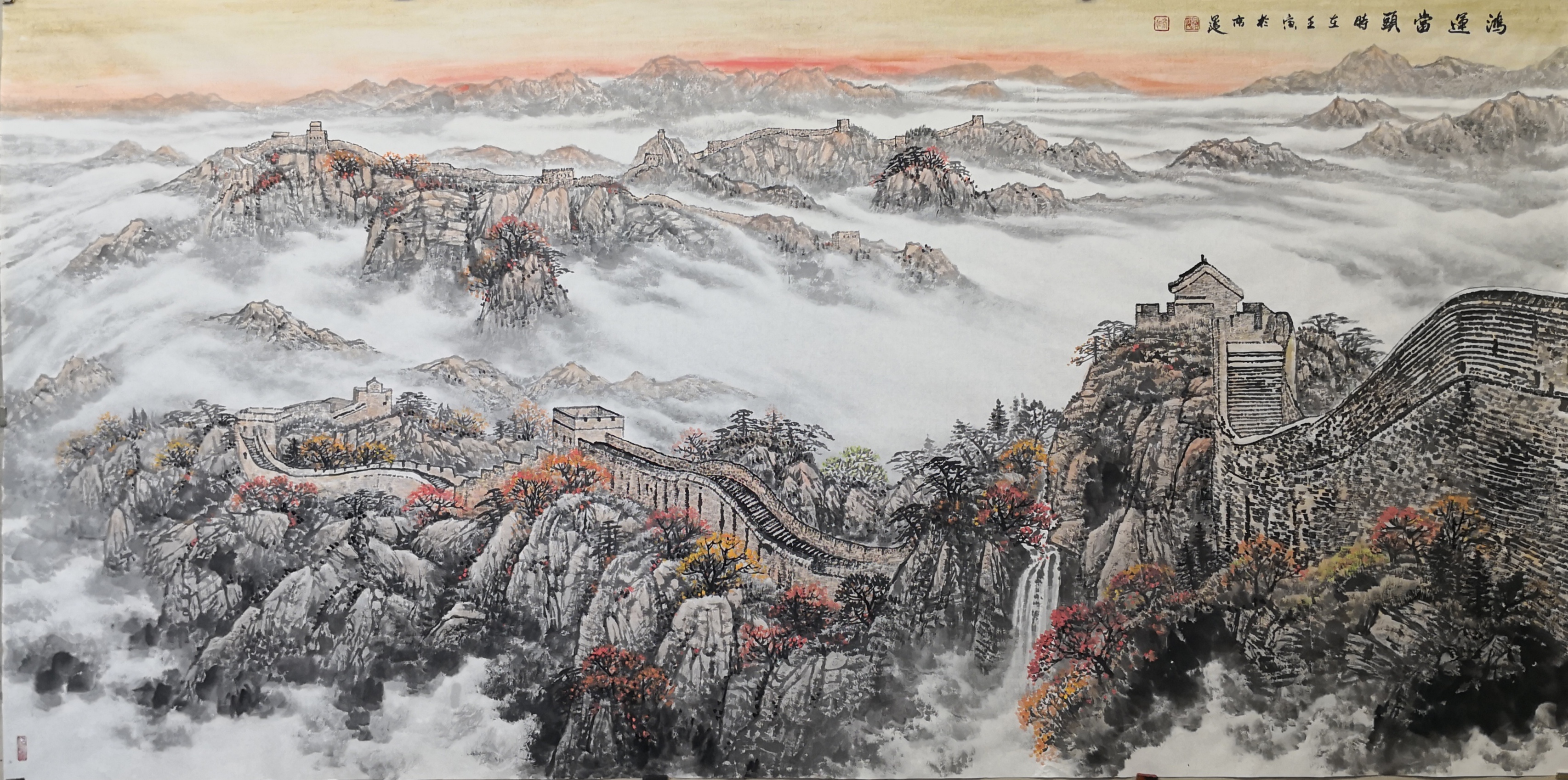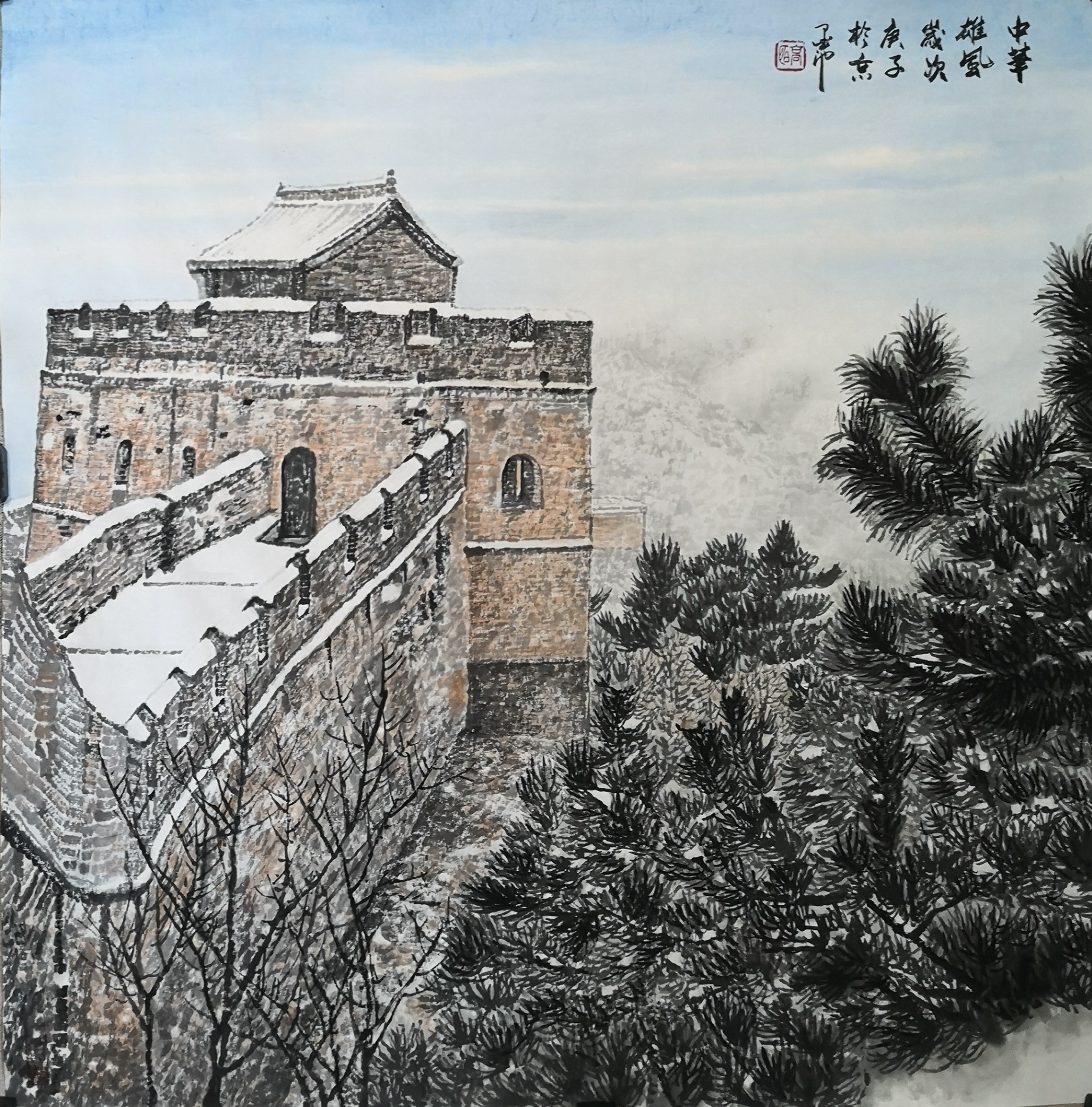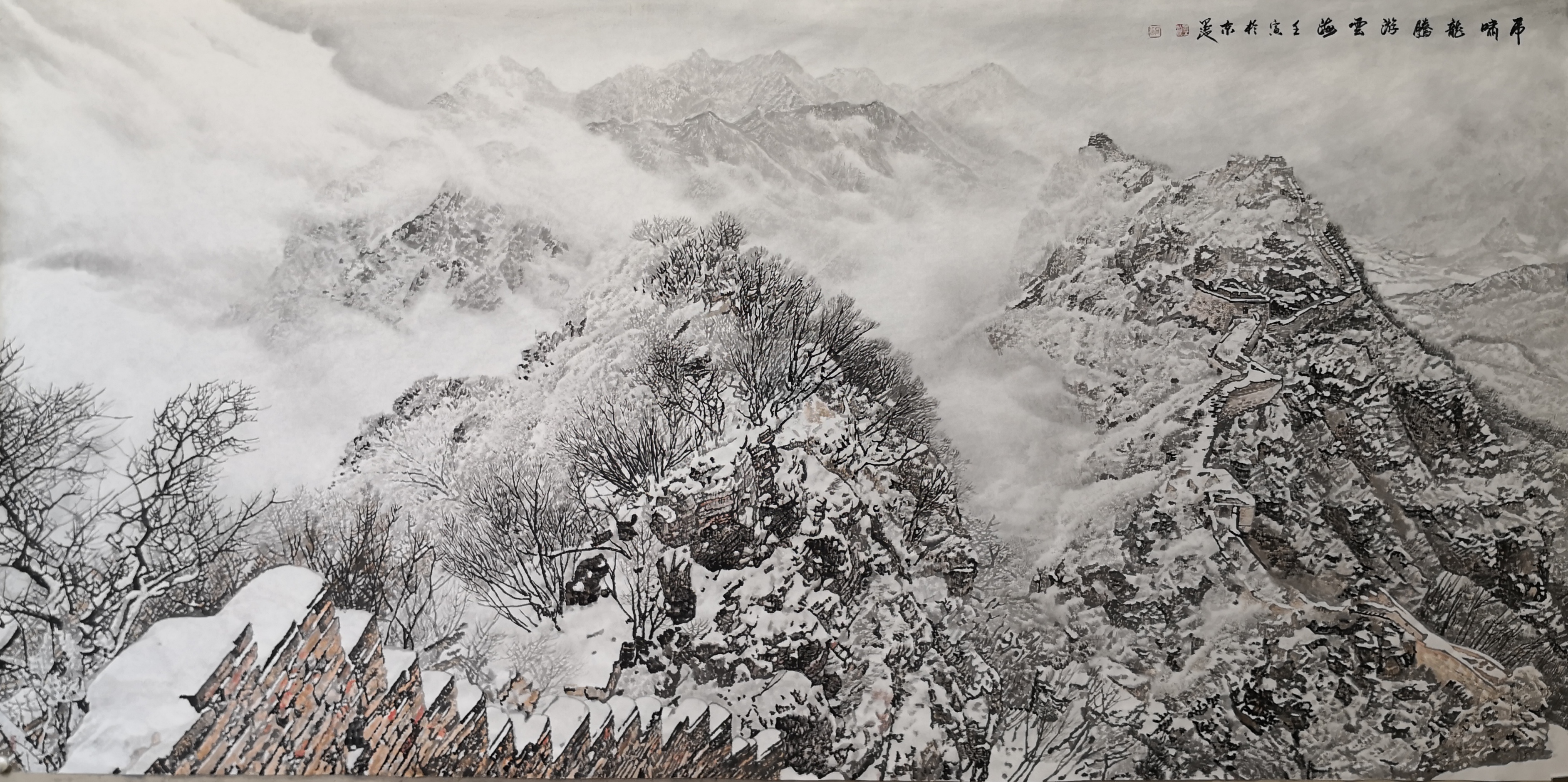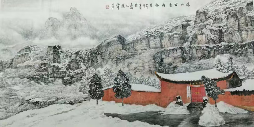 笔法的微观与宏观。高明独创“冰晶皴法”,以枯笔散锋轻扫纸面,营造出冰雪特有的晶莹质感;又以浓墨焦笔勾勒长城砖石,让千年沧桑跃然纸上。观其作画过程,时而如“银瓶乍破”般挥洒写意,时而如“绣花引针”般精雕细琢,在宏大气象与微观细节间游刃有余。
